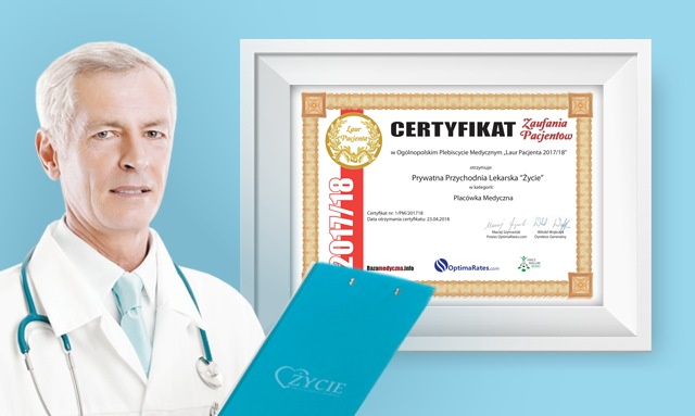 Mamy zaszczyt poinformować, że w 2018 roku nasza placówka po raz kolejny otrzymała certyfikat zaufania Pacjentów “Laur Pacjenta”. To już czwarte wyróżnienie z rzędu! Odznaczenie zostało przyznane w ramach Ogólnopolskiego Plebiscytu Medycznego i pełni role godła jakości świadczonych usług w roku ubiegłym.