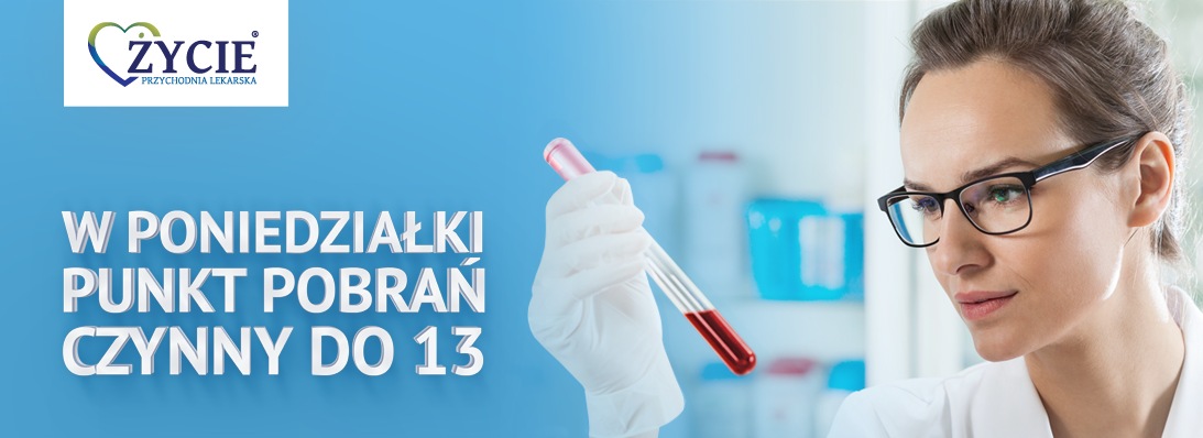 Miło nam poinformować, że od 2019 roku w każdy poniedziałek punkt pobrań w Przychodni Lekarskiej Życie będzie czynny o 2 godziny dłużej, czyli do godziny 13:00. Godzina rozpoczęcia pozostaje bez zmian, zaczynamy o 7:00. W pozostałe dni, czyli od wtorku do soboty punkt pobrań będzie czynny według dotychczasowych zasad, czyli od 7:00 do 11:00.