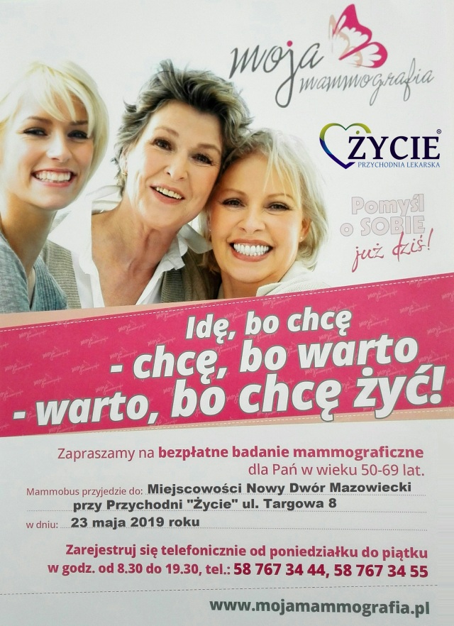 Już 23 maja na parkingu Przychodni Lekarskiej Życie pojawi się mammobus, w którym będzie można wykonać bezpłatne przesiewowe badanie mammograficzne w kierunku wykrycia raka piersi.