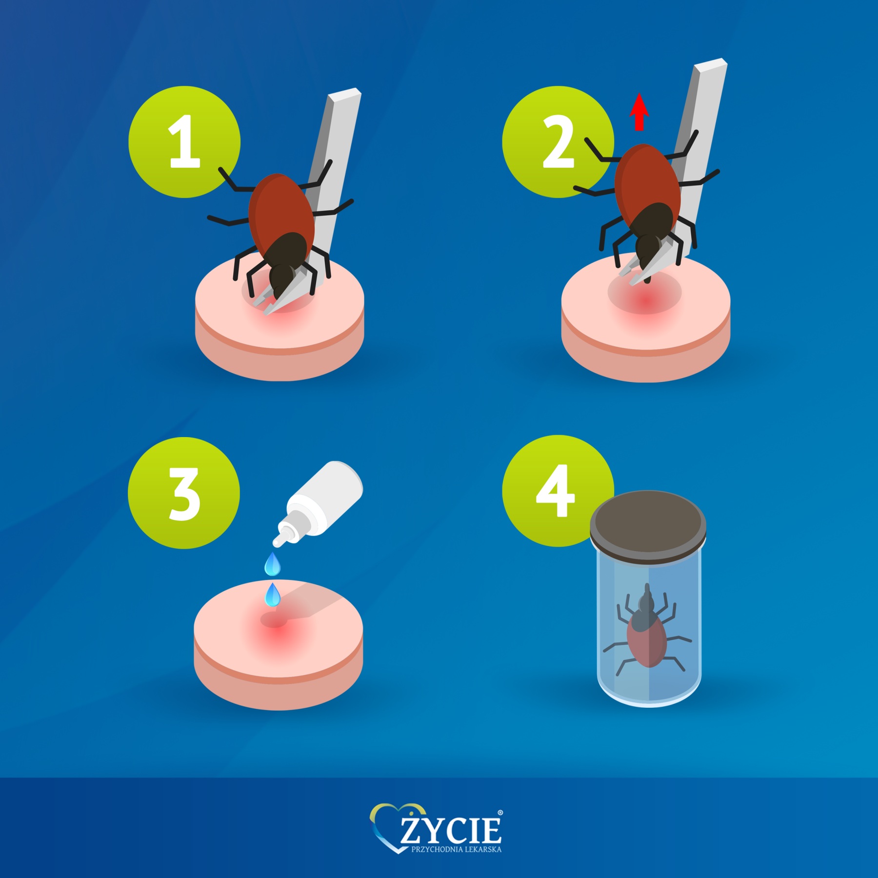 Zdezynfekuj ranę. Następnie obserwuj miejsce wkłucia pod kątem wystąpienia rumienia, który może być pierwszym objawem boreliozy. W przypadku wystąpienia zaczerwienienia należy natychmiast skontaktować się z lekarzem!