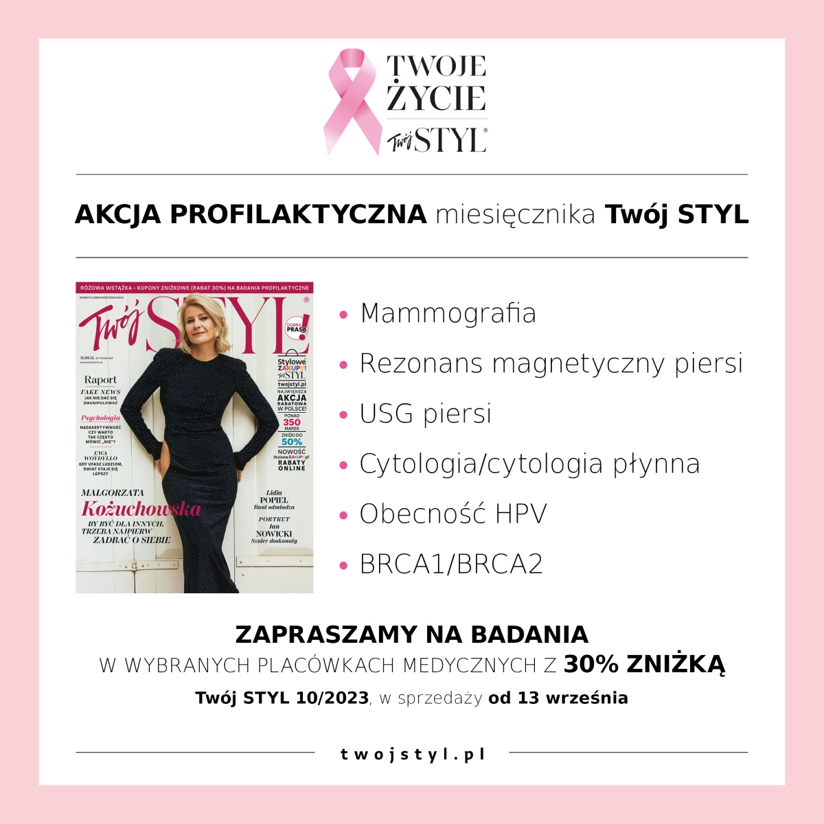 To już 27. edycja akcji „Twoje życie Twój STYL”, w ramach której Twój STYL zamieszcza kupony dające prawo do aż 30% rabatu na badania profilaktyczne.